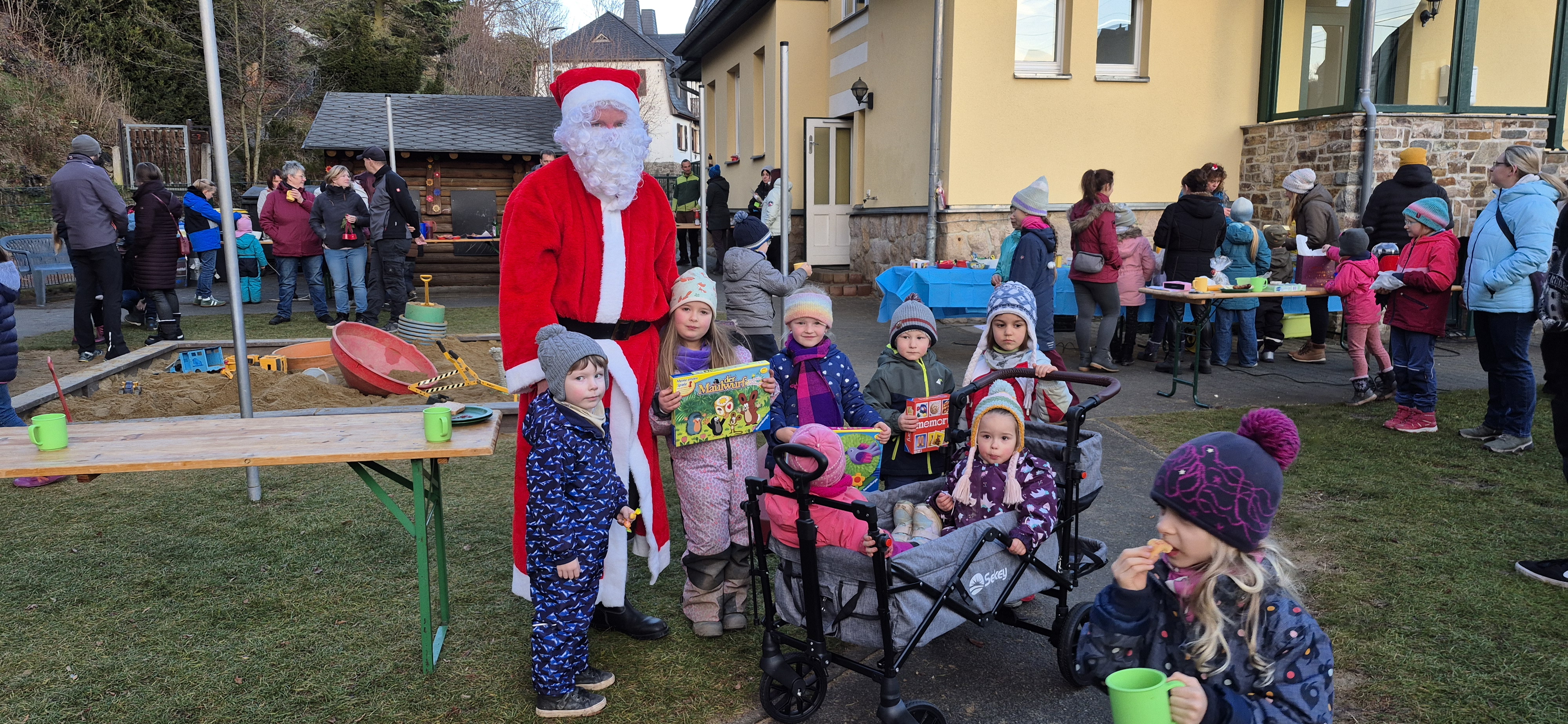 Ein ganz besonderer Höhepunkt war der Überraschungsbesuch des Weihnachtsmannes, der mit seinem Laster bei uns vorbeikam. Er brachte viele schöne Geschenke mit. Legos, Würfelspiele, Buntstifte und für unsere jüngsten Kinder einen wunderschönen Bollerwagen. So können wir nun wieder alle gemeinsam auf Entdeckungstouren in den Wald gehen.